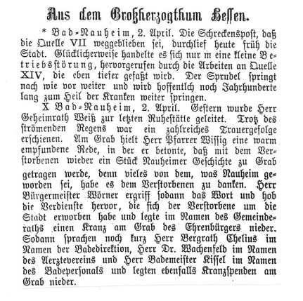 Veröffentlichungen vorwiegend zu den geologischen Verhältnissen der hiesigen Quellen, seine Schrift „Zur Gründung und Entwicklung des Solbades Nauheim“ (1875), sowie die Festrede zum 50jährigen Bestehen des Großen Sprudels (1896) wurden auch weiteren Kreisen bekannt.