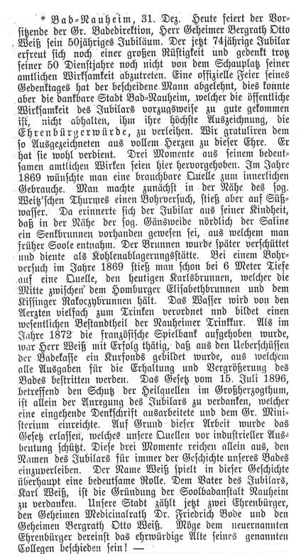 Ehrenbürger der Stadt Bad Nauheim, geboren in Altengronau, Sohn des in Nauheim wohlbekannten Salineninspektors Carl Weiß (1795-1877), der als Gründer der hiesigen Solbadeanstalt gilt. Nach Studium der Bergwissenschaften ab 1860 an der Nauheimer Saline, zuletzt mit dem Titel Geheimer Bergrath, ab 1866 zusätzlich mit den Geschäften des Badedirektors betraut.